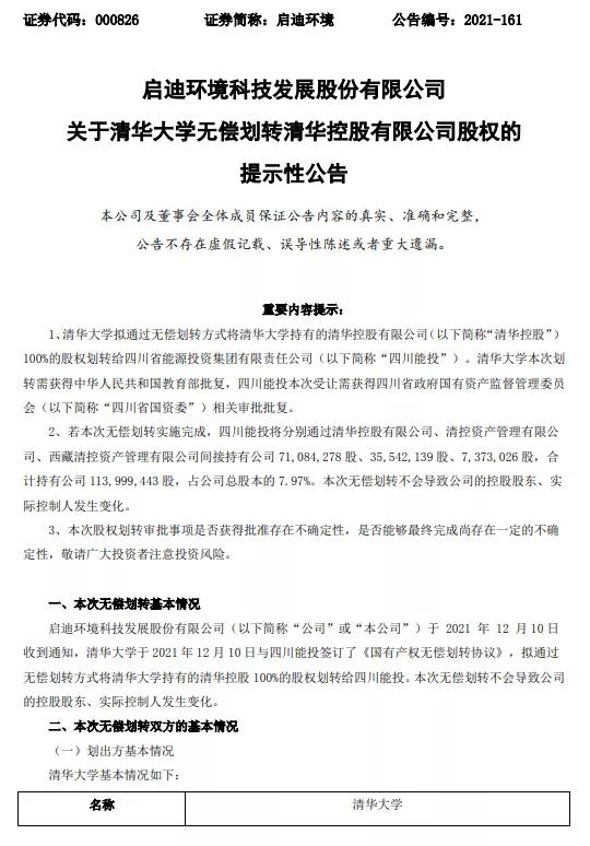 城發(fā)環(huán)境吸并啟迪環(huán)境一事,又有新消息。 不過,這一次不是兩家公司自己的動作,而是啟迪環(huán)境的母公司有了新變動。 12月11日,啟迪環(huán)境發(fā)布公告稱,四川省能源投資集團有限責(zé)任公司(下稱“四川能投”)與清華大學(xué)于12月10日簽署《國有產(chǎn)權(quán)無償劃轉(zhuǎn)協(xié)議》,以無償劃轉(zhuǎn)方式接收清華大學(xué)持有的清華控股100%股權(quán)...