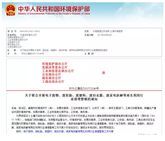 近日,環(huán)境保護(hù)部聯(lián)合發(fā)展改革委等五部委印發(fā)《關(guān)于聯(lián)合開展電子廢物、廢輪胎、廢塑料、廢舊衣服、廢家電拆解等再生利用行業(yè)清理整頓的通知》。環(huán)境保護(hù)部土壤環(huán)境管理司司長(zhǎng)邱啟文就此次清理整頓開展的背景、主要目標(biāo)和任務(wù)回答了記者的提問(wèn)。問(wèn):環(huán)境保護(hù)部等6部門聯(lián)合開展電子廢物、廢輪胎、廢塑料、廢舊衣服、廢家電拆...