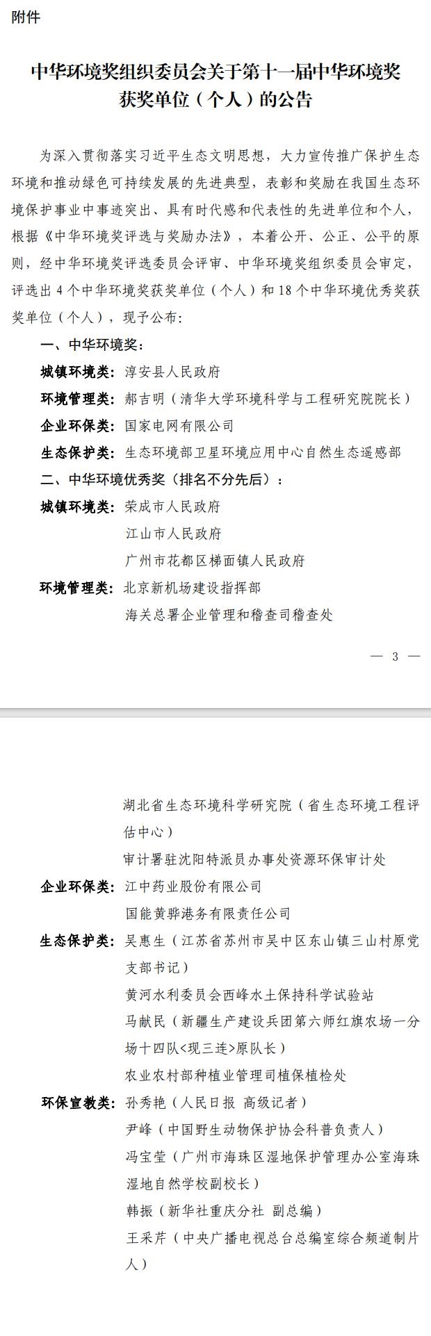 關于公布第十一屆中華環(huán)境獎評選結(jié)果的通知 國務院各有關部門辦公廳(室),各省、自治區(qū)、直轄市和計劃單列市生態(tài)環(huán)境廳(局): 為深入貫徹落實習近平生態(tài)文明思想,大力宣傳推廣保護生態(tài)環(huán)境和推動綠色可持續(xù)發(fā)展的先進典型,堅決打好污染防治攻堅戰(zhàn),建設美麗中國,促進人與自然和諧共生,由全國人大環(huán)資委、全國政協(xié)...