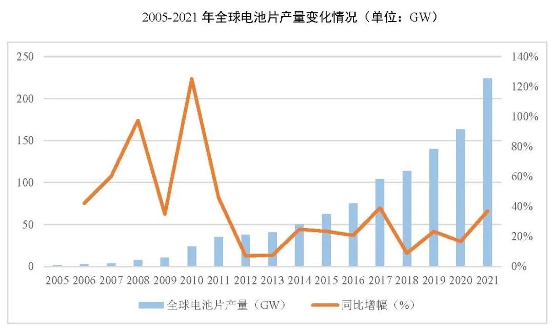 一、全球電池片產(chǎn)業(yè)發(fā)展情況 2021年太陽能電池片環(huán)節(jié)延續(xù)了2020年的擴產(chǎn)基調(diào),產(chǎn)能大幅增加。全球晶硅太陽能電池片總產(chǎn)能達到423.5GW,同比增長69.8%;總產(chǎn)量為223.9GW,同比增長37%。 從產(chǎn)能情況看,頭部企業(yè)持續(xù)擴產(chǎn),前十名全部為中國企業(yè)。天合光能、晶澳科技、晶科能源等也不斷擴大電...