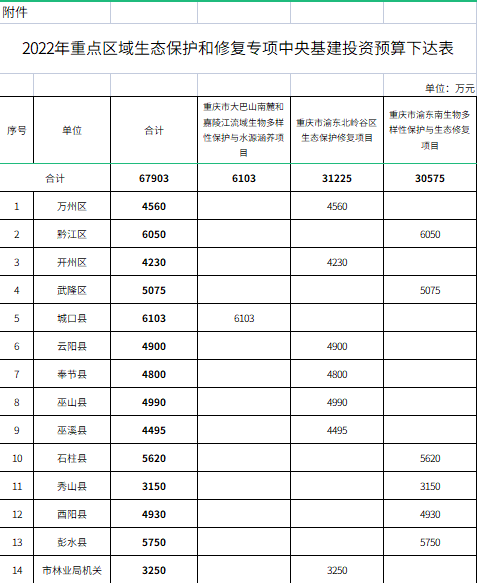 重慶市財政局關(guān)于下達(dá)2022年重點區(qū)域生態(tài)保護和修復(fù)專項中央基建投資預(yù)算的通知有關(guān)區(qū)縣(自治縣)財政局,市林業(yè)局: 根據(jù)《財政部關(guān)于下達(dá)2022年重點區(qū)域生態(tài)保護和修復(fù)專項(第一批)中央基建投資預(yù)算的通知》(財建〔2022〕127號)、《財政部關(guān)于下達(dá)2022年重點區(qū)域生態(tài)保護和修復(fù)專項(第二批)中...