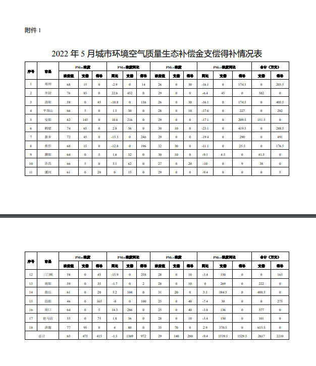 根據(jù)《河南省污染防治攻堅(jiān)戰(zhàn)領(lǐng)導(dǎo)小組辦公室關(guān)于印發(fā)河南省城市環(huán)境空氣質(zhì)量生態(tài)補(bǔ)償辦法(試行)等辦法的通知》(豫環(huán)攻堅(jiān)辦〔2020〕15號(hào))要求,河南省生態(tài)環(huán)境廳廳對各省轄市的城市環(huán)境空氣質(zhì)量生態(tài)補(bǔ)償金的支償、得補(bǔ)情況進(jìn)行了計(jì)算。截止2022年5月,各省轄市共支償城市環(huán)境空氣質(zhì)量生態(tài)補(bǔ)償金2617萬元,...