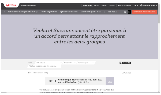 威立雅和蘇伊士宣布,昨晚(4月12日)各自的董事會原則上就兩集團(tuán)合并的主要條款和條件達(dá)成協(xié)議。兩家公司以每股Suez股份20.50歐元的價(jià)格(附息票)為條件達(dá)成協(xié)議。 該協(xié)議將從工業(yè)和社會的角度出發(fā),創(chuàng)建新的蘇伊士公司,該公司的資產(chǎn)由一個(gè)連貫的,可持續(xù)的部門組成,并具有真正的增長潛力,營業(yè)額約為70...