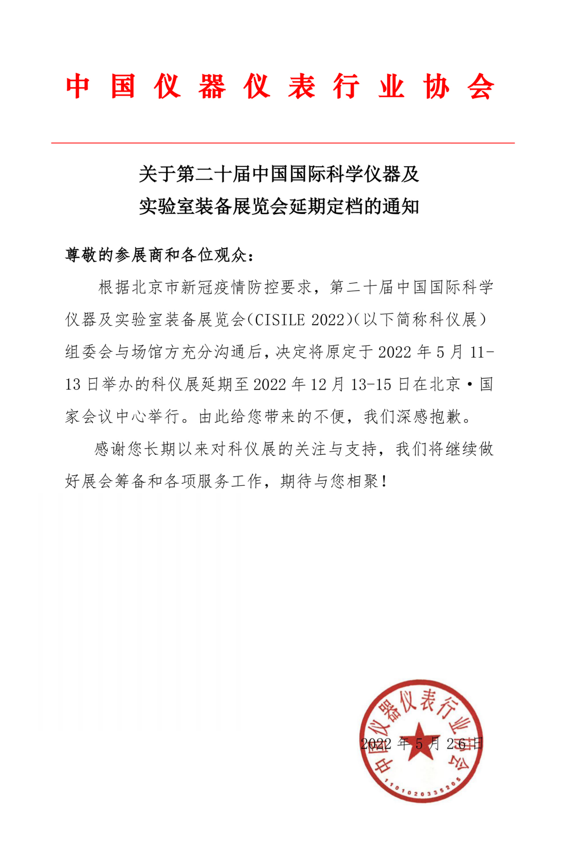 關(guān)于第二十屆中國(guó)國(guó)際科學(xué)儀器及實(shí)驗(yàn)室裝備展覽會(huì)延期定檔的通知尊敬的參展商和各位觀眾: 根據(jù)北京市疫情防控要求,第二十屆中國(guó)國(guó)際科學(xué)儀器及實(shí)驗(yàn)室裝備展覽會(huì)(CISILE 2022)(以下簡(jiǎn)稱科儀展)組委會(huì)與場(chǎng)館方充分溝通后,決定將原定于2022年5月11-13日舉辦的科儀展延期至2022年12月13-...