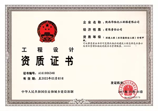 2017年5月5日,陜西華陸化工環(huán)保有限公司獲環(huán)境工程(水污染防治工程)專項設(shè)計甲級資質(zhì)證書。住房和城鄉(xiāng)建設(shè)部對照現(xiàn)行工程設(shè)計資質(zhì)標(biāo)準(zhǔn),經(jīng)過仔細(xì)篩選、反復(fù)核查申報材料,最終審核授予華陸環(huán)保環(huán)境工程(水污染防治工程)專項設(shè)計甲級資質(zhì)。本次從乙級資質(zhì)升級為甲級資質(zhì),是對華陸環(huán)保整體設(shè)計水平和綜合實力的全面考核。