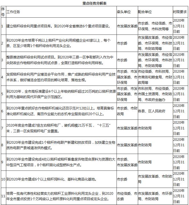 (一)秸稈綜合利用龍頭企業(yè)提升工程。建立秸稈綜合利用重點項目庫,到2020年全市推進 6 個重點項目建設(shè)。到2020年全市培育千噸以上秸稈產(chǎn)業(yè)化利用規(guī)模企業(yè)40家以上,每個縣、區(qū)至少培育1個秸稈綜合利用龍頭企業(yè)。整縣區(qū)推進秸稈綜合利用試點項目,在秸稈資源量豐富、秸稈產(chǎn)業(yè)化利用基礎(chǔ)較好的地區(qū),鼓勵秸稈產(chǎn)業(yè)與扶貧工作相結(jié)合,優(yōu)先安排中央財政農(nóng)作物秸稈綜合利用試點項目,實行整縣區(qū)推進,到2020年爭取三縣一區(qū)都列入中央財政農(nóng)作物秸稈綜合利用試點縣。發(fā)揮秸稈綜合利用產(chǎn)業(yè)博覽會平臺作用,推廣成熟的秸稈綜合利用產(chǎn)業(yè)技術(shù)體系,做好博覽會簽約項目的孵化培育、落地生根。(牽頭單位:市農(nóng)委、市發(fā)展改革委、市環(huán)保局;配合單位:市科技局、市經(jīng)信委、市商務(wù)和糧食局、市財政局)