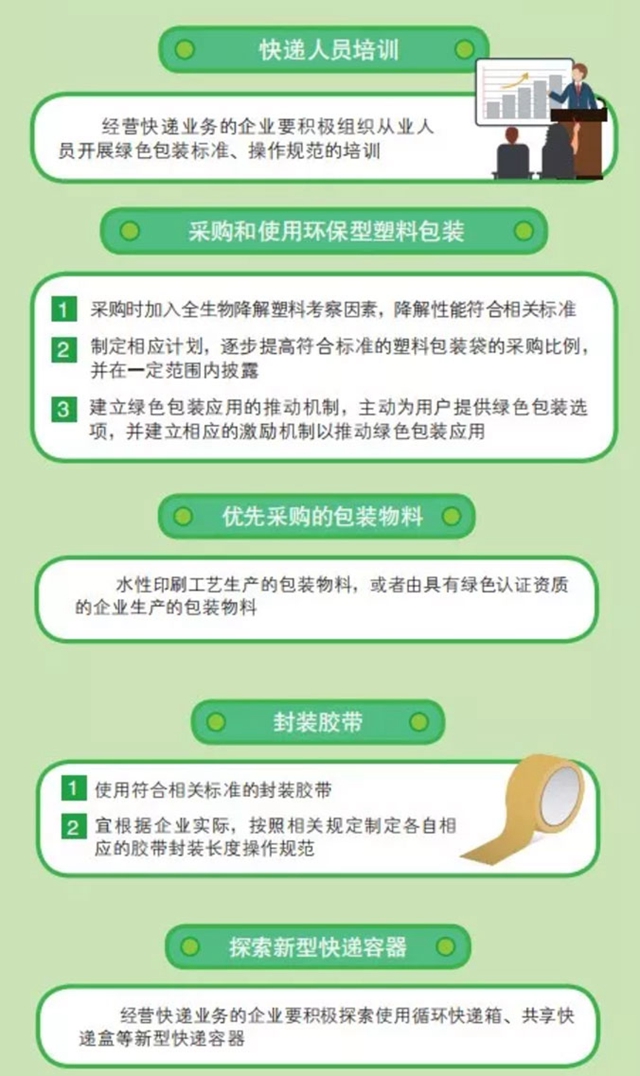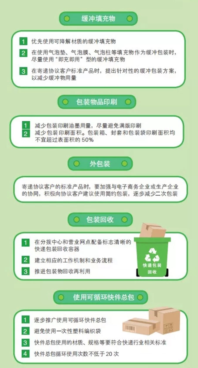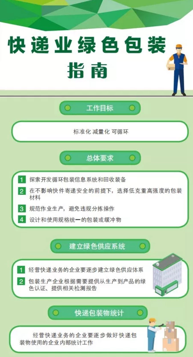 為貫徹落實習(xí)近平生態(tài)文明思想,打好郵政業(yè)污染防治攻堅戰(zhàn),指導(dǎo)經(jīng)營快遞業(yè)務(wù)的企業(yè)做好綠色包裝工作,根據(jù)《快遞暫行條例》等有關(guān)規(guī)定,國家郵政局制訂發(fā)布了《快遞業(yè)綠色包裝指南(試行)》(以下簡稱《指南》),規(guī)定了行業(yè)綠色包裝工作的目標(biāo),即快遞業(yè)綠色包裝堅持標(biāo)準(zhǔn)化、減量化和可循環(huán)的工作目標(biāo),加強與上下游協(xié)同,逐步實現(xiàn)包裝材料的減量化和再利用。