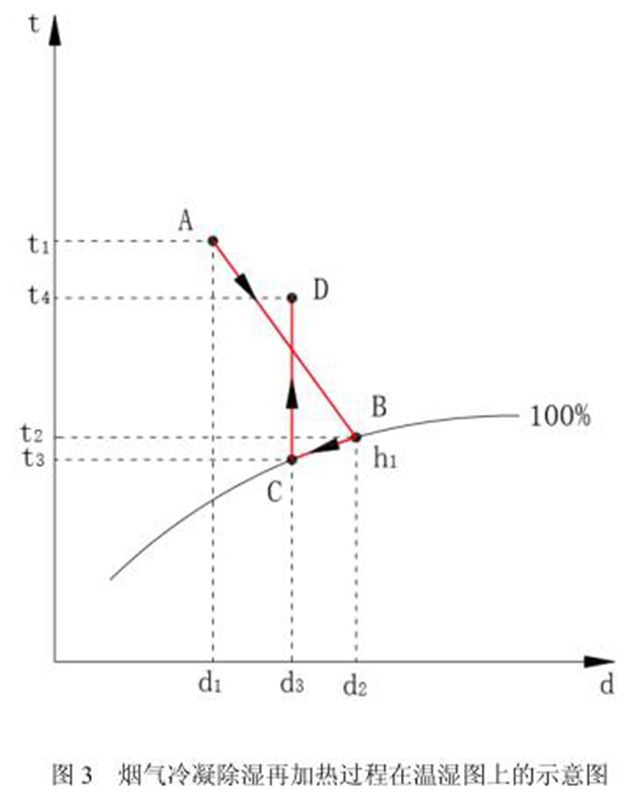 這是一個等焓增濕的過程。采用直接或間接的方式對飽和狀態(tài)B的煙氣進行冷卻,部分汽態(tài)水釋放氣化潛熱發(fā)生相變而凝結為液態(tài)水,順著等100%的相對濕度線從B點處理到C點,煙氣仍為相對濕度100%的飽和煙氣,但絕對濕度降低為d2-d3,煙氣中的水蒸氣含量降低。