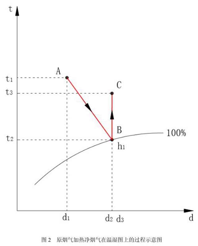 通過間壁式換熱器加熱凈煙氣,提高凈煙氣的溫度,降低凈煙氣的相對濕度。煙氣在焓濕圖上的處理過程如下圖 2 所示。