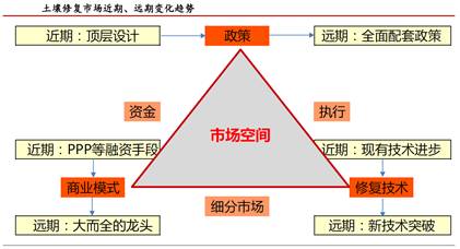 政策層面。長期尺度下,政策層面最值得期待的驅(qū)動因素是在土壤修復(fù)所有領(lǐng)域、全國大部分區(qū)域的配套性政策全面出臺。與短期尺度相比,長期尺度下政府必須向治理難度更大、經(jīng)濟效益更弱的修復(fù)任務(wù)“開刀”。