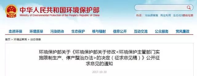 2017年10月30日,環(huán)境保護(hù)部網(wǎng)站公布修改《環(huán)境保護(hù)主管部門實(shí)施限制生產(chǎn)、停產(chǎn)整治辦法》的決定(征求意見稿)(以下簡稱“征求意見稿”),并向社會(huì)公開征求意見。