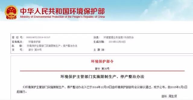 《環(huán)境保護(hù)主管部門實(shí)施限制生產(chǎn)、停產(chǎn)整治辦法》已于2014年12月15日由環(huán)境保護(hù)部部務(wù)會(huì)議審議通過,現(xiàn)予公布,自2015年1月1日起施行。