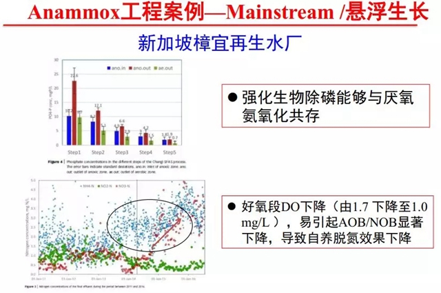 除了污泥消化液、工業(yè)廢水,近五年全球擴(kuò)大了對Anammox在城市污水主流程中的應(yīng)用。新加坡樟宜再生水廠是新加坡最大的再生水廠,也是國際上首個強(qiáng)化生物除磷與厭氧氨氧化在大型污水廠共存的案例。短污泥齡和適宜溶解氧是實(shí)現(xiàn)懸浮游離厭氧氨氧化菌生長的必要條件,在好氧區(qū)實(shí)現(xiàn)部分硝化和亞硝酸鹽積累,缺氧區(qū)進(jìn)行厭氧氨氧化反應(yīng)(脫氮貢獻(xiàn)率30%),整體工藝能耗降低10%-30%,池容減少10%-40%。新加坡公用事業(yè)局的科學(xué)家曹業(yè)始博士在該污水廠Anammox技術(shù)的設(shè)計和應(yīng)用中發(fā)揮了重要作用。