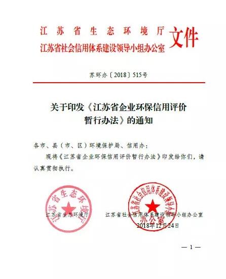 日前,江蘇省生態(tài)環(huán)境廳聯(lián)合省信用辦印發(fā)了《江蘇省企業(yè)環(huán)保信用評(píng)價(jià)暫行辦法》,自2019年1月1日起施行。