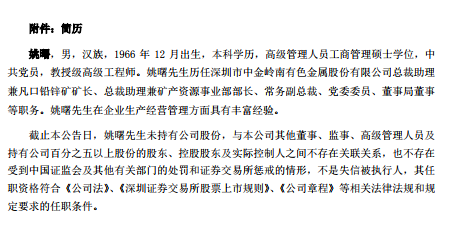 姚曙,男,漢族,1966年12月出生,本科學歷,高級管理人員工商管理碩士學位,中共黨員,教授級高級工程師。姚曙歷任深圳市中金嶺南有色金屬股份有限公司總裁助理兼凡口鉛鋅礦礦長、總裁助理兼礦產(chǎn)資源事業(yè)部部長、常務副總裁、黨委委員、董事局董事等職務。其在企業(yè)生產(chǎn)經(jīng)營管理方面具有豐富經(jīng)驗。