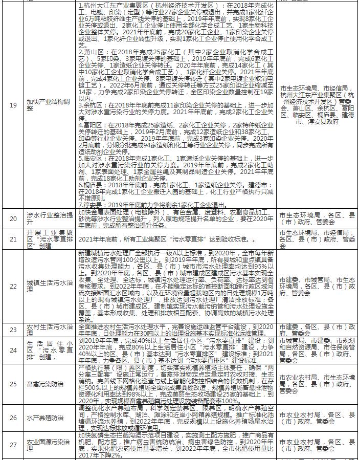 2.強(qiáng)化工業(yè)污染治理。制定涉水重污染行業(yè)“杭州標(biāo)準(zhǔn)”,到2020年,完成化工、印染、造紙等涉水重污染行業(yè)地方排放標(biāo)準(zhǔn)的制定。結(jié)合傳統(tǒng)產(chǎn)業(yè)改造提升行動(dòng),加快錢塘江流域化工、印染、造紙等企業(yè)或產(chǎn)能的搬遷改造,到2022年完成369家企業(yè)關(guān)停轉(zhuǎn)遷。加快金屬表面處理(電鍍除外)、有色金屬、廢塑料、農(nóng)副食品加工、砂洗等涉水行業(yè)整治提升,列入原地規(guī)范提升名單的企業(yè),要在2020年年底前完成所有整治提升任務(wù)。開(kāi)展工業(yè)集聚區(qū)“污水零直排區(qū)”創(chuàng)建,2021年年底前,所有工業(yè)集聚區(qū)“污水零直排”達(dá)到驗(yàn)收標(biāo)準(zhǔn)。加快建立工業(yè)集聚區(qū)截污納管、雨污分流、排水許可證發(fā)放等管理的“一園一檔”。在全面完成重點(diǎn)排污單位自動(dòng)監(jiān)控設(shè)施安裝和聯(lián)網(wǎng)的基礎(chǔ)上,加強(qiáng)自動(dòng)監(jiān)控設(shè)施運(yùn)行管理,進(jìn)一步強(qiáng)化監(jiān)督執(zhí)法。