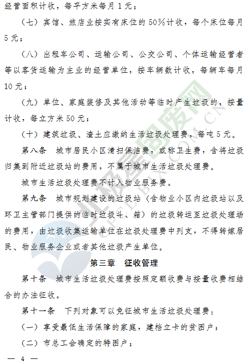 (九)單位、家庭裝修及其他活動(dòng)等臨時(shí)產(chǎn)生垃圾的,按量計(jì)收,每立方米50元;