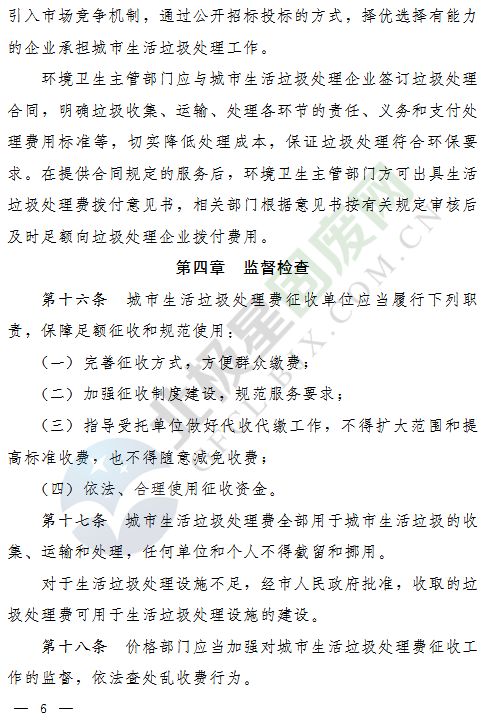 答:國家建設(shè)部《城市生活垃圾管理辦法》及《河南省城市生活垃圾處理管理辦法》中規(guī)定:國家對(duì)城市生活垃圾的清掃、收集、運(yùn)輸和處理服務(wù)實(shí)行收費(fèi)制度。