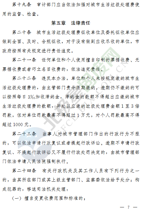 答:違反本辦法,單位和個(gè)人未按規(guī)定繳納城市生活垃圾處理費(fèi)的,由主管部門責(zé)令限期繳納。逾期仍不繳納的可以按照每日千分之三加收滯納金,滯納金的數(shù)額不得超出應(yīng)繳納城市生活垃圾處理費(fèi)的數(shù)額,并處以應(yīng)繳納垃圾處理費(fèi)金額1至3倍罰款,但對(duì)單位罰款最高不得超過1萬元,對(duì)個(gè)人罰款最高不得超過1000元。