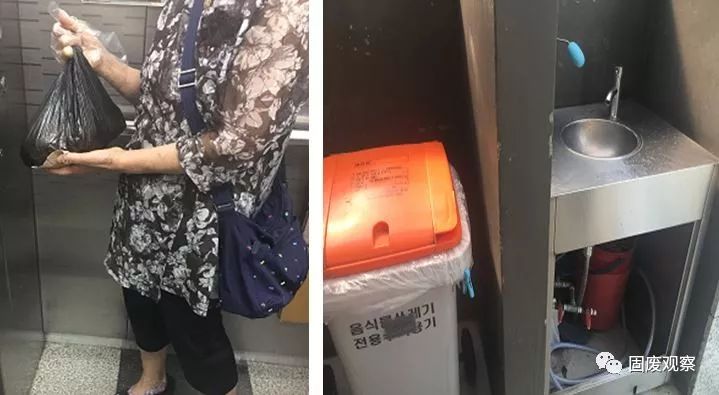 第三種是居民購買重量制食物垃圾袋的方式。居民可以將食物垃圾裝在袋子里丟棄。為方便居民丟棄食物垃圾,很多小區(qū)的食物垃圾回收桶旁邊常設(shè)有洗手池和肥皂(如下圖)。