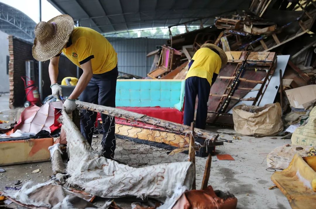 △城管委帶隊督查花都區(qū)垃圾分類成效,供銷社垃圾分類點,工作人員在將回收回來的低附加值廢棄家具進行破拆,分類成木材、布料、海綿等經行回收。圖為工作人員在破拆一張沙發(fā)