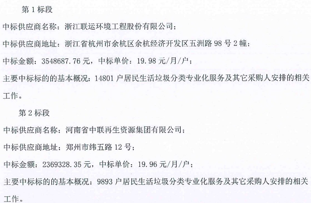 鄭州市金水區(qū)生活垃圾分類專業(yè)化服務采購項目發(fā)布中標公告,浙江聯運環(huán)境工程股份有限公司獲得包一,中標金額354.87萬,合同期限為1年。