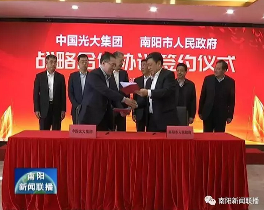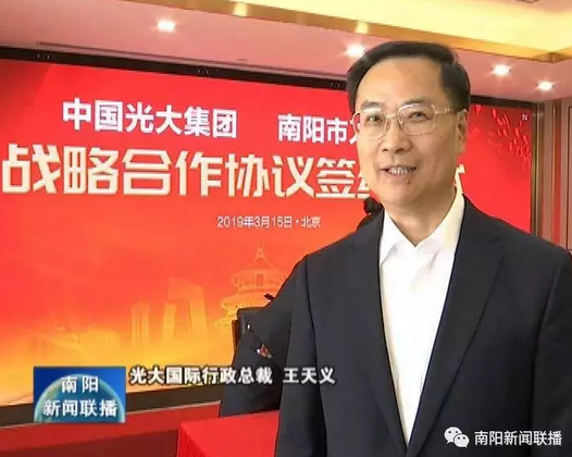 光大國(guó)際行政總裁 王天義:河南是我們很重要的戰(zhàn)略投資地。我們覺(jué)得南陽(yáng)又是中國(guó)河南地級(jí)市當(dāng)中最大的市,是個(gè)人口大市、經(jīng)濟(jì)大市,也是一個(gè)環(huán)保大市。所以我們想通過(guò)集團(tuán)與南陽(yáng)市政府戰(zhàn)略合作,全面推進(jìn)我們光大國(guó)際環(huán)保產(chǎn)業(yè)跟南陽(yáng)市政府全面的合作,從垃圾焚燒發(fā)電開(kāi)始切入,逐步向靜脈產(chǎn)業(yè)園,向無(wú)廢城市拓展我們的合作領(lǐng)域和空間,全面參與南陽(yáng)市生態(tài)文明建設(shè)和經(jīng)濟(jì)社會(huì)的統(tǒng)籌發(fā)展。