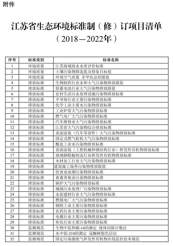 附件:江蘇省生態(tài)環(huán)境標準制(修)訂項目清單(2018-2022年)