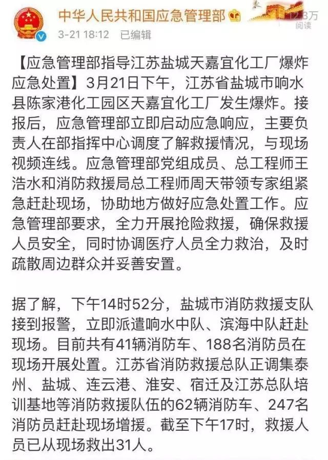 3月21日下午,江蘇省鹽城市響水縣陳家港化工園區(qū)天嘉宜化工廠發(fā)生爆炸。接報(bào)后,應(yīng)急管理部立即啟動(dòng)應(yīng)急響應(yīng)。