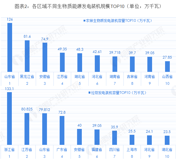 各個(gè)區(qū)域發(fā)展側(cè)重點(diǎn)不同,山東農(nóng)林生物質(zhì)發(fā)電規(guī)模第一,浙江垃圾發(fā)電規(guī)模第一