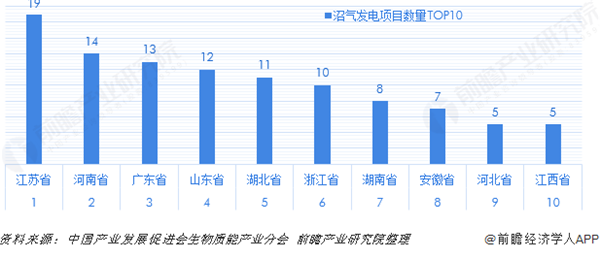 整體規(guī)模較小的沼氣發(fā)電項(xiàng)目擁有量最高的是江蘇省,項(xiàng)目數(shù)量達(dá)19個(gè);排在第二名的是河南省,項(xiàng)目數(shù)量為14個(gè);廣東省的項(xiàng)目數(shù)量為13個(gè),排在第三位;山東、河北、浙江的項(xiàng)目數(shù)量均在10個(gè)以上,其余省市的項(xiàng)目數(shù)量較少。