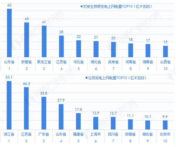 從各省市的生物質(zhì)發(fā)電上網(wǎng)電量的規(guī)模排行來看,山東省、浙江省和廣東省分別為農(nóng)林生物質(zhì)發(fā)電上網(wǎng)電量、垃圾發(fā)電上網(wǎng)電量和沼氣發(fā)電上網(wǎng)電量的擁有量的第一位,規(guī)模分別為63億千瓦時(shí)、53.1億千瓦時(shí)和2.93億千瓦時(shí)。安徽省、黑龍江省、江蘇省、河北省、湖北省和吉林省得農(nóng)林生物質(zhì)發(fā)電上網(wǎng)電量均超過20億千瓦時(shí);江蘇省、廣東省和山東省的垃圾發(fā)電上網(wǎng)電量也在20億千瓦時(shí)之上;沼氣發(fā)電的規(guī)模整體較少,除了廣東之外,江西、河南、江蘇、浙江、湖南和北京的沼氣發(fā)電上網(wǎng)電量也排在前列。