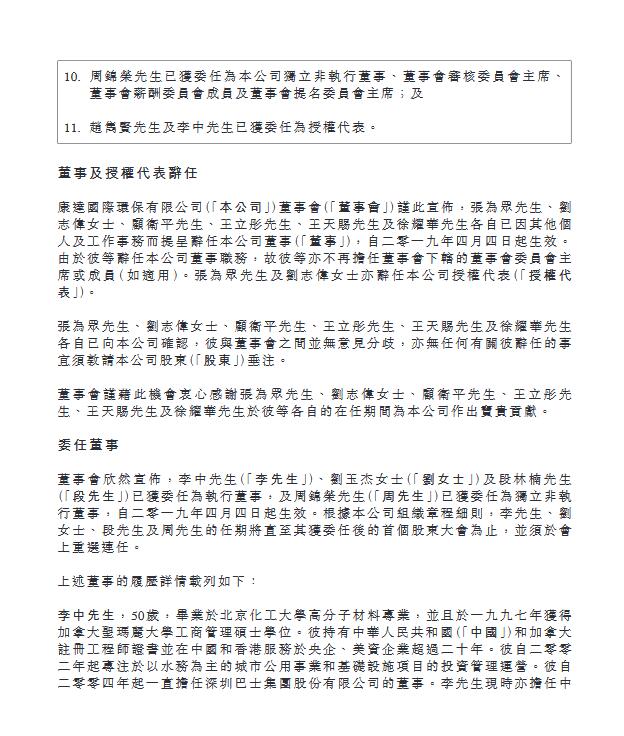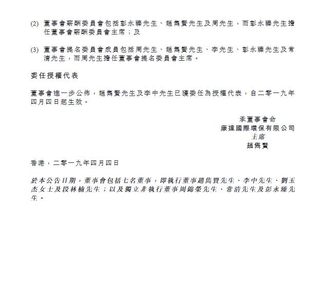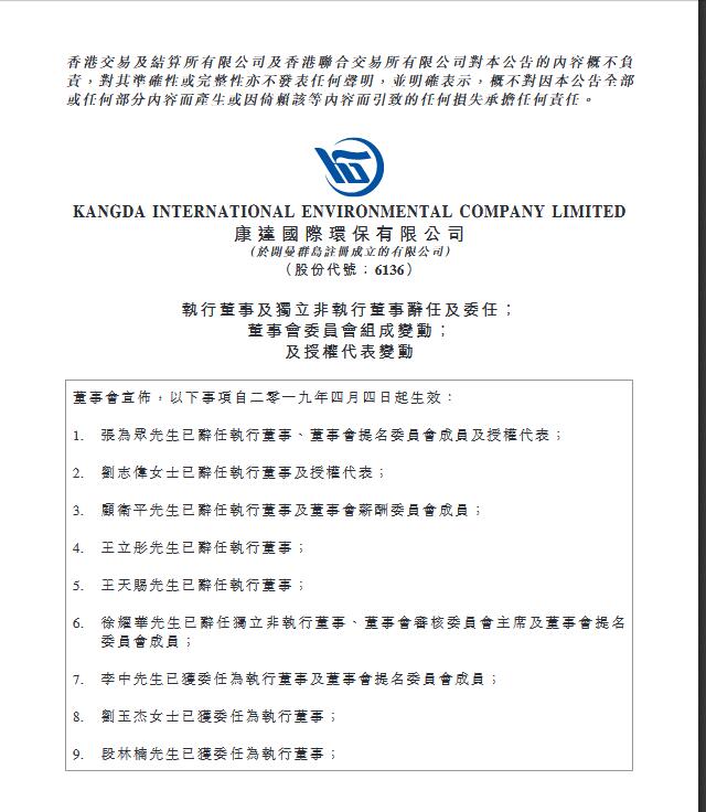 康達(dá)環(huán)保發(fā)布公告,張為眾已辭任執(zhí)行董事、董事會提名委員會成員及授權(quán)代表;劉志偉已辭任執(zhí)行董事及授權(quán)代表;顧衛(wèi)平已辭任執(zhí)行董事及董事會薪酬委員會成員;王立彤已辭任執(zhí)行董事;王天賜已辭任執(zhí)行董事;徐耀華已辭任獨(dú)立非執(zhí)行董事、董事會審核委員會主席及董事會提名委員會成員。