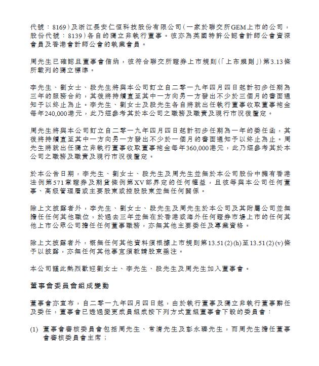 李中已獲委任為執(zhí)行董事及董事會提名委員會成員;劉玉杰已獲委任為執(zhí)行董事;段林楠已獲委任為執(zhí)行董事;周錦榮已獲委任為公司獨(dú)立非執(zhí)行董事、董事會審核委員會主席、董事會薪酬委員會成員及董事會提名委員會主席;趙雋賢及李中已獲委任為授權(quán)代表;4月4日起生效。
