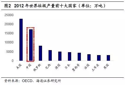 我國城鎮(zhèn)垃圾產(chǎn)量巨大。根據(jù)國家統(tǒng)計局數(shù)據(jù),2000年我國的常住人口城鎮(zhèn)化率僅為36.22%,到2015年末為56.1%,年均增加1.33個百分點,城鎮(zhèn)人口的不斷增加使得城鎮(zhèn)生活垃圾產(chǎn)生量與日俱增。根據(jù)OECD數(shù)據(jù),2012年我國垃圾清運量僅次于美國,高居世界第二位,且遙遙領先于后面的俄羅斯、巴西、德國等國家。根據(jù)國家統(tǒng)計局數(shù)據(jù),2001年我國垃圾清運量為1.35億噸,2015年為1.91億噸,CAGR為3.27%。