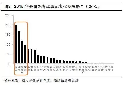 城鎮(zhèn)垃圾無害化處理缺口巨大。以人均垃圾產(chǎn)生量1.2kg/日來計算,2015年我國城鎮(zhèn)垃圾生產(chǎn)總量為3.38億噸,而2015年我國垃圾清運量為1.91億噸,對應缺口巨大。另一方面,從清運量看,2015年我國生活垃圾無害化處理量為1.8億噸,無害化處理率為94.1%,對應全國無害化處理總缺口為1129萬噸,分省區(qū)來看,缺口最大的有廣東(196萬噸)、北京(168萬噸)、黑龍江(114萬噸)、甘肅(94萬噸)。2006-2015年間,我國生活垃圾無害化處理缺口累計超過3.6億噸。