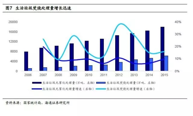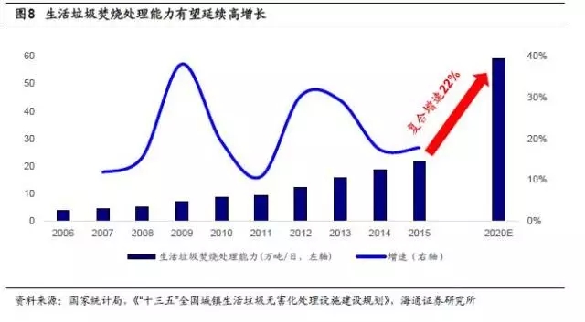 生活垃圾焚燒處理量增速高于無害化處理整體水平,“十三五”期間有望延續(xù)高增長。我國生活垃圾焚燒處理量增長迅速,從2006年的1138萬噸增長至2015年的6176萬噸,十年間復合增速高達20.68%,遠高于生活垃圾無害化處理領域整體9.63%的復合增速。行業(yè)在經(jīng)歷了2012、2013年的高速增長后,2014、2015年增速略有下滑,2015年生活垃圾焚燒處理量增速為15.87%,處理能力增速為17.8%,整個“十二五”期間焚燒處理量復合增速24.15%,根據(jù)《“十三五”全國城鎮(zhèn)生活垃圾無害化處理設施建設規(guī)劃》,到2020年生活垃圾焚燒處理能力將達到59.14萬噸/日,十三五期間生活垃圾焚燒處理能力復合增速將達到22%,行業(yè)高增長有望延續(xù)。