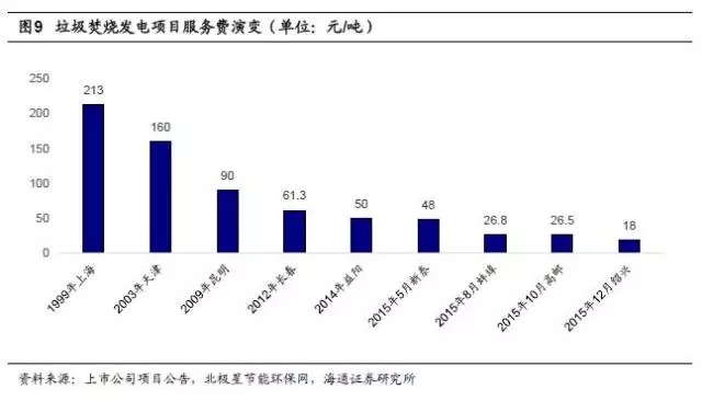 行業(yè)競爭加劇,處理費下行。在市場參與者逐漸增多和行業(yè)競爭逐步加劇的背景下,近年新建的垃圾焚燒項目處理費呈下降趨勢。2015年以來,一些企業(yè)為了搶占市場而壓低價格,低價中標項目涌現(xiàn):2015年山東新泰項目中標價48元/噸,安徽蚌埠項目中標價26.8元/噸,江蘇高郵項目中標價26.5元/噸,浙江紹興項目中標價更是降至18元,擾亂市場正常秩序。除去少數(shù)惡意壓低價格的項目,根據(jù)中國經(jīng)濟導報統(tǒng)計,近年來垃圾焚燒特許經(jīng)營項目處理費每噸平均在60~80元,整體呈現(xiàn)小幅下降的趨勢。