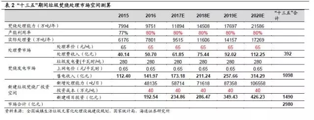 按照垃圾焚燒規(guī)劃新增處理能力對市場空間進行測算,“十三五”期間垃圾焚燒處理費市場空間總計近400億元,焚燒發(fā)電市場空間約1100億元,兩者合計運營收入約1500億元;此外,新增處理能力所需的建設投資總計近1500億元,垃圾焚燒市場空間巨大。