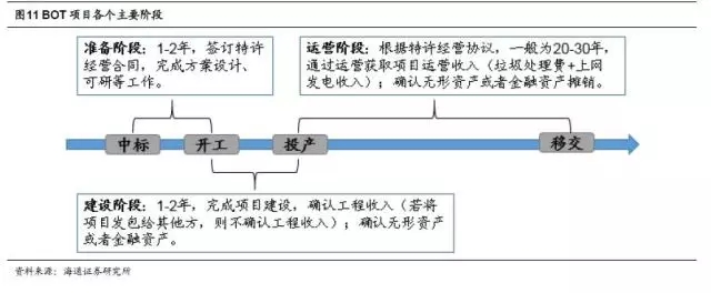 對項目公司而言,項目中標后,主要會經(jīng)歷三個階段,分別是準備階段(一般為1-2年,完成項目的前期準備工作,簽訂特許經(jīng)營合同,完成環(huán)評、可研報告等工作)、建設階段(一般為1-2年,完成項目建設,確認工程收入,若項目外包給其他方,則不確認)和運營階段(在特許經(jīng)營期內(nèi),負責項目的運營,獲取垃圾處理費補貼和上網(wǎng)發(fā)電收入),特許經(jīng)營期到期之后,項目無償移交給政府。