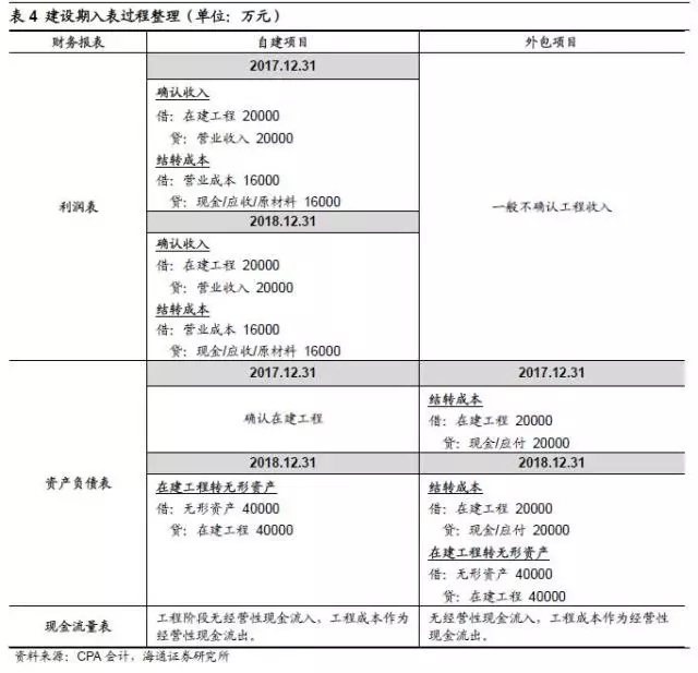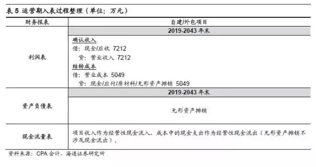 若該項目為項目公司自建,則建設期項目公司將根據(jù)完工進度確認工程收入并計入在建工程,項目完工后在建工程轉為無形資產(chǎn),工程階段雖有工程收入并確認利潤,但并無實際經(jīng)營性現(xiàn)金流入。若項目公司將項目發(fā)包,通常不確認工程收入,即建造期不影響利潤表,根據(jù)完工進度向承包方支付工程款,確認在建工程,項目完工后將在建工程結轉為無形資產(chǎn)。項目運營階段,公司確認項目運營收入(主要是垃圾處理費和上網(wǎng)發(fā)電收入),結轉相關成本,成本項包含無形資產(chǎn)的攤銷。項目建設期和運營期的主要會計科目錄入如表4和表5: