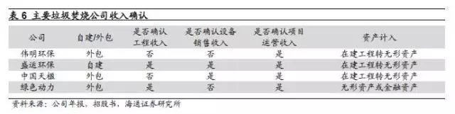 通常而言,對于垃圾焚燒BOT項目,如果公司自建,則會確認工程收入,如果將項目外包,則不確認工程收入。四家公司中,盛運環(huán)保項目主要為自建,并且確認工程收入,而偉明環(huán)保和中國天楹主要采取外包的方式,不確認工程收入。綠色動力有所不同,公司將項目發(fā)包給其他方,但考慮到其對項目負有整體履約責任并承擔所有費用和風險,在項目建造階段確認相應的建造收入,該等建造收入根據(jù)獨立評估師評定的公允價值計量。此外,盛運環(huán)保和中國天楹確認設備銷售收入,偉明環(huán)保與綠色動力則不確認,四家公司都確認項目運營收入。