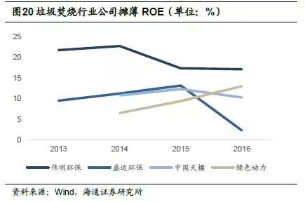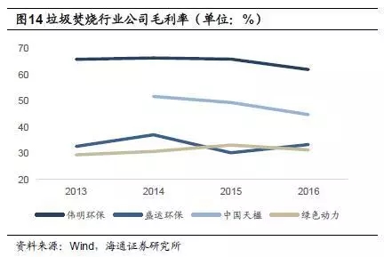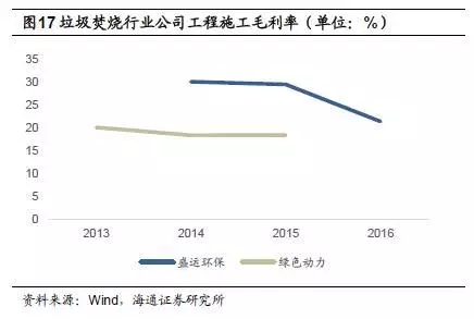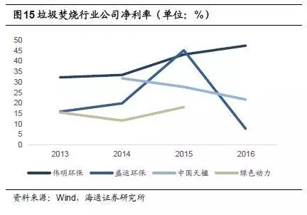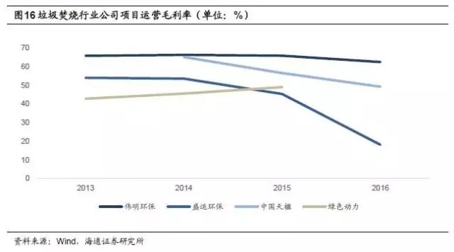 偉明環(huán)保項目運營毛利率較高,2015年為65.9%,2016年小幅下降,為62.5%;中國天楹運營業(yè)務毛利率也相對較高,2016年為49.2%,但相較于2014年的65.1%下滑近16個百分點;綠色動力2015年毛利率為49.0%;盛運環(huán)保2015年運營業(yè)務毛利率為45.3%,2016年為18.0%。