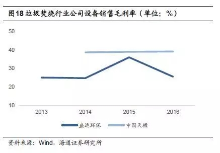 盛運環(huán)保和中國天楹兩家公司確認設備銷售毛利率,中國天楹設備毛利率較為穩(wěn)定,近三年維持在38%-39%之間,盛運環(huán)保設備銷售毛利率略低,2015年為36.0%,2016年為25.5%。