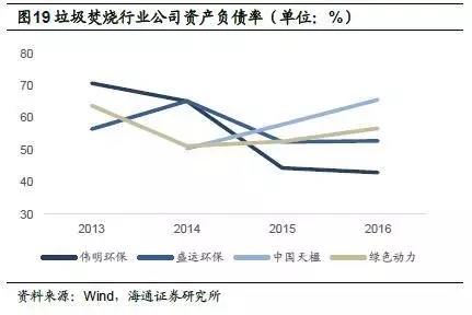 偉明環(huán)保ROE較高,2016年為17%,但相較2013、2014年有一定下滑;盛運環(huán)保2016年ROE出現(xiàn)較大下滑,僅為2.3%;中國天楹2016年ROE為10.3%;綠色動力ROE上升趨勢明顯,2016年達到13.0%,較2015年上升3.6個百分點。