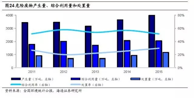 危險廢物產(chǎn)生量大,綜合利用處置率有待提高。根據(jù)環(huán)境統(tǒng)計年報數(shù)據(jù),2015年全國工業(yè)危險廢物產(chǎn)生量為3976萬噸,占一般工業(yè)固體廢物產(chǎn)生量的1.22%,過去十年年均復合增長率約為12%;綜合利用量為2050萬噸,綜合利用率52%;處置量1174萬噸,處置率30%;貯存量810.3萬噸(含前期);危廢綜合利用處置率約為82%。