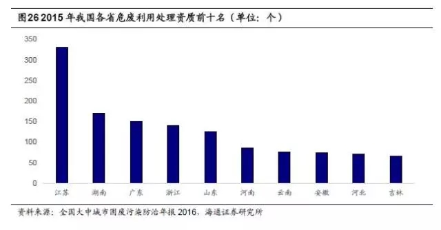 我國危廢綜合利用與處置行業(yè)格局分散,市場集中度較低。2015年全國危廢許可證(含醫(yī)療危廢)數(shù)量為2034個,較前一年增加113個,其中江蘇省頒發(fā)的危廢許可證數(shù)量為327個,數(shù)量上排名第一,湖南、廣東分列二、三位,數(shù)量在150個左右,浙江、山東也超過100個。截止到2015年,全國危險廢物經(jīng)營單位核準經(jīng)營規(guī)模達到5263萬噸/年,其中核準利用規(guī)模為4155.1萬噸/年,核準處置規(guī)模為982.4萬噸/年,平均每個許可證僅對應2.59萬噸/年的利用和處置能力。根據(jù)2008年環(huán)保部公布的危廢處置名單,當時全國1500多家具有危廢處理資質(zhì)的企業(yè)中,處理能力達到1000噸/日的企業(yè)僅占0.3%,目前行業(yè)格局沒有太大變化。