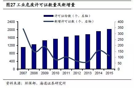 我國政府對危廢處理行業(yè)實行許可證制度。這一方面能夠保證從事危廢處理業(yè)務的公司基本擁有較強的技術實力和項目經(jīng)驗,從而保障危廢無害化處理的效率,減少處理不當造成的二次污染;另一方面,實行許可證制度會限制新進企業(yè)數(shù)量,限制全國危廢綜合利用和處置總量。