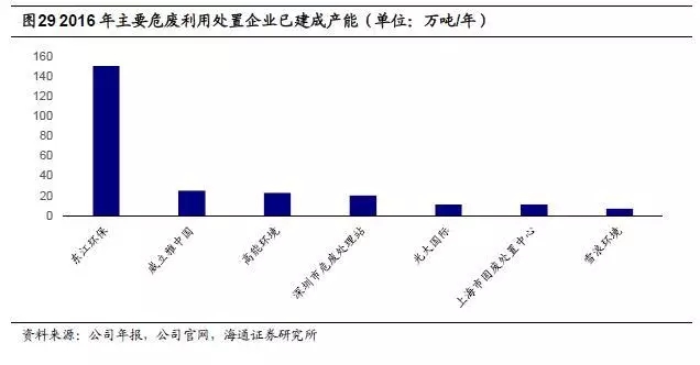 東江環(huán)保龍頭地位顯著。截止2016年底,東江環(huán)保已擁有國家危險廢物名錄中46大類中的44類危廢經(jīng)營資質(zhì),僅次于威立雅中國,公司危廢利用和處置資質(zhì)近150萬噸/年(其中無害化處置資質(zhì)達到72萬噸/年),遠遠高于威立雅中國,另根據(jù)公司規(guī)劃,預計到2020年總產(chǎn)能將達到350萬噸(其中無害化產(chǎn)能達到200萬噸),增長空間可觀。