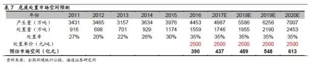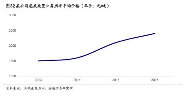 危廢處置價格穩(wěn)步上升,市場空間巨大。從核準經(jīng)營規(guī)???,危廢處置產(chǎn)能緊缺,2015年核準處置規(guī)模僅982.4萬噸/年。近年來,危廢處置價格呈現(xiàn)穩(wěn)步上升趨勢。以行業(yè)內(nèi)某領先企業(yè)為例,2013年,其危廢處置業(yè)務平均價格為1500元/噸左右,2016年則上升至2500元/噸左右。以全國環(huán)境統(tǒng)計公報數(shù)據(jù)為基礎,假設未來幾年危廢產(chǎn)生量保持過去十年復合增長率12%的增速,保守估計處置率為35%,單位處置成本為2500元/噸,則預計2020年危廢處置市場為613億元,2017-2020處置市場空間總計2086億元??紤]到還有大量的危廢沒有進入國家統(tǒng)計口徑,若將這些量考慮在內(nèi),市場空間還將提升2-3倍。